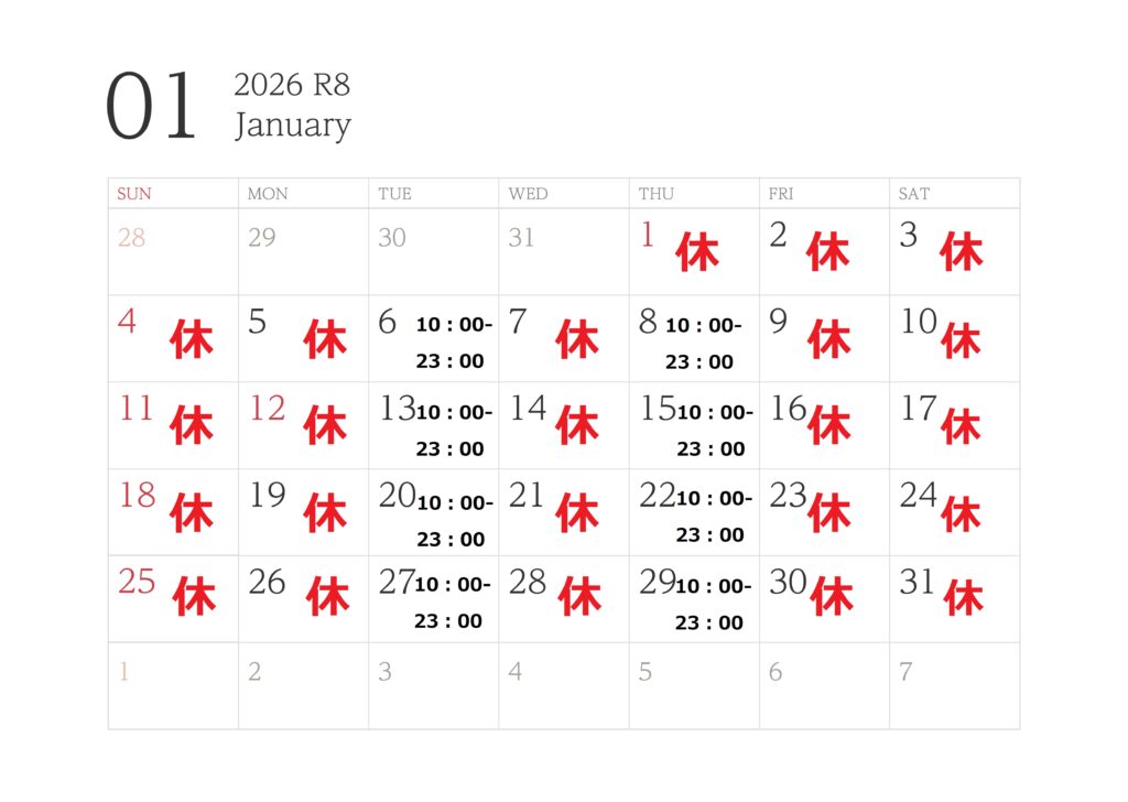 1月の営業日のカレンダーを作成しましたのでご確認ください。