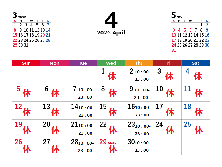 このたび、4月の営業カレンダーを作成いたしました。ご利用を検討されている方は、ぜひご確認ください。