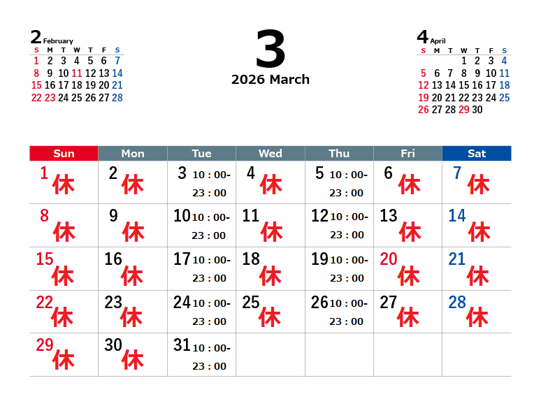 2月の営業カレンダーを作成いたしましたので、ご確認ください。